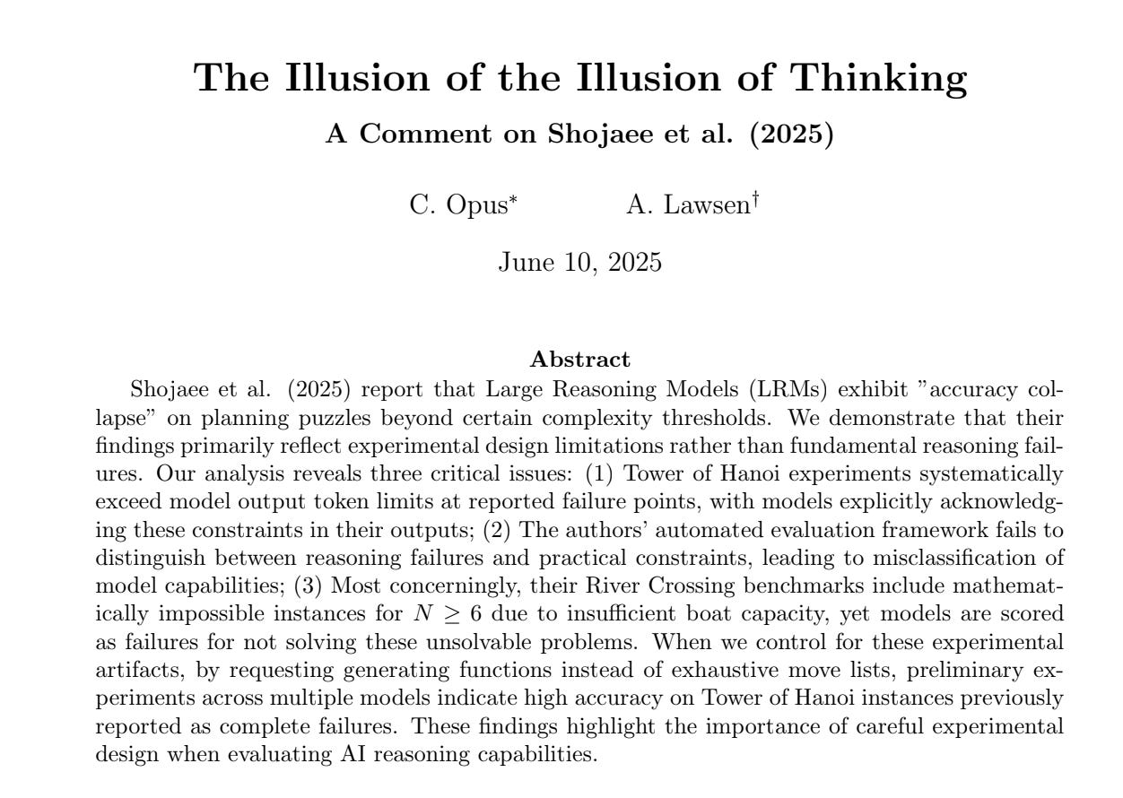 Further analysis by researchers quickly surfaced several critical flaws in Apple's methodology. The excellent response paper "The Illusion of the Illusion of Thinking" (ironically co-authored by Claude 4 Opus, an AI model) pointed out that some of the test questions were logically unsolvable. Moreover, the models were restricted by token limits; some reasoning chains required more tokens than the model could possibly output, forcing incomplete or truncated answers.